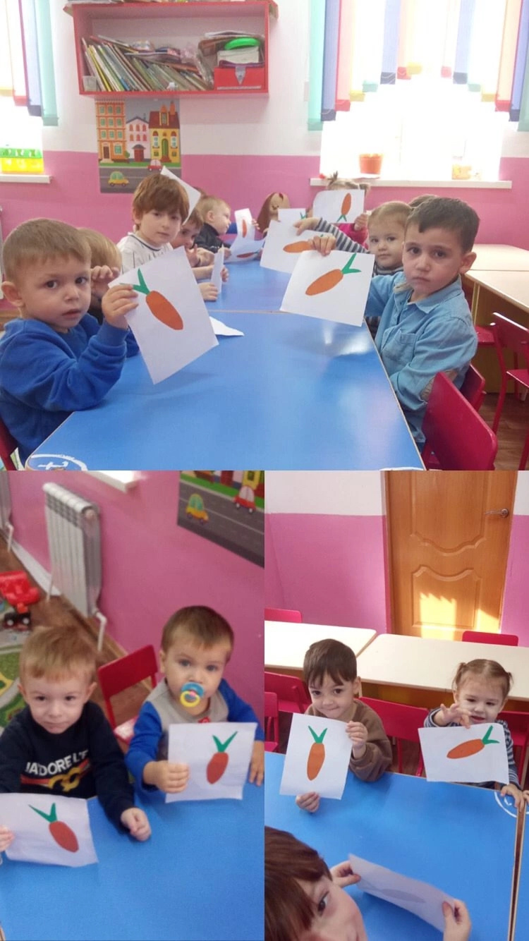 Тема: ,,Морковка для зайчика ". Цель: приобщать детей к искусству аппликации,формировать интерес к этому виду деятельности.